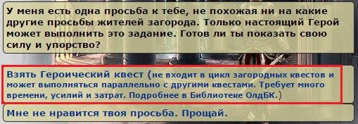 Выполнять квест можно параллельно с другими загородными квестами. Квестовые боты, задействованные в квесте, общаются на тему Героического квеста только в случае, когда у персонажа нет текущего загородного квеста или таймаута на выполнение загородных квестов. Т.е. если игрок готов к следующему диалогу по квесту, ему надо дождаться окончания суточного таймаута на загородные квесты и не брать новый загородный квест прежде, чем будет пройден нужный диалог.