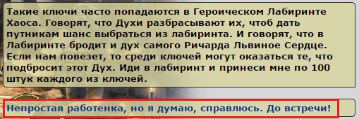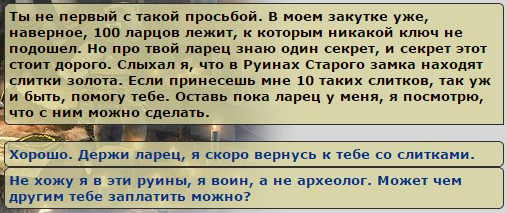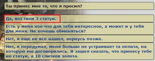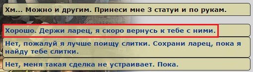 В следующем диалоге есть выбор одного из двух направлений первого этапа - это 10 золотых слитков или 3 любые статуи. Если вы ходите в руины и у вас есть слитки, то выбирайте первый вариант квеста, если вы не любите ходить в руины или у вас нет слитков, то выбирайте второй вариант, в котором нужно принести статуи из Лабиринта Хаоса. Выбираем второй вариант так как он обойдётся дешевле первого.