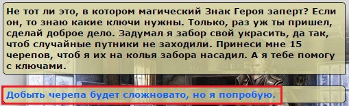 Важное примечание: Персонажи, не имеющие склонности, данный квест закончить не смогут, так как один из его этапов требует выбивание черепов, который невозможно пройти будучи серым персонажем.