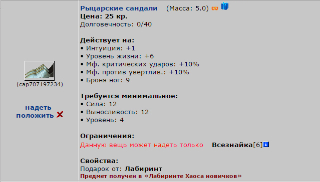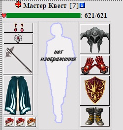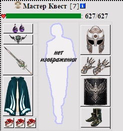 Футболка Учителей (мф), Плащ героя, Доспех Оруженосца (мф) 5 Подгонов, Меч Гиганта +5, Ангельский Шлем (мф) желательно 5 Подгонов, Перчатки Кошмаров (мф) желательно 5 Подгонов, Щит Вещей Птицы (мф) желательно 5 Подгонов, Сапоги Барона (мф) желательно 5 Подгонов, Кулон Пегаса (мф) желательно 5 Подгонов, Серьги Лунного Камня (мф) желательно 5 Подгонов, 3 Кольца Глаз Дракона (мф) желательно 5 Подгонов. |