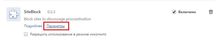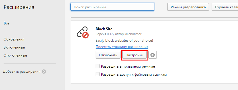 После установки переходим в Расширения (кликабельно) и нажимаем Параметры