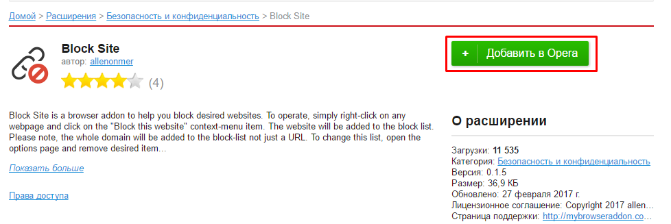 Запускаем браузер Opera. Переходим в магазин расширений и скачиваем это расширение "SiteBlock" (кликабельно). Нажимаем "Добавить в Opera"