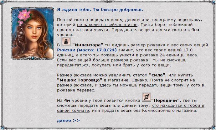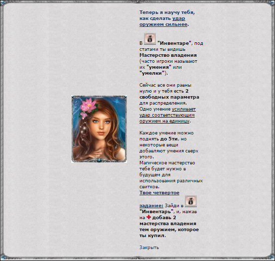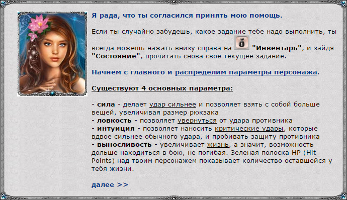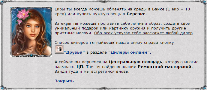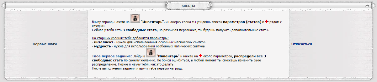 Сразу же после регистрации, тебя будет ждать гид по начальным квестам, с которым вы пройдете Первые шаги.