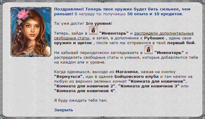 Поздравляем! Вы достигли 1 уровня! Вы получили возможность повышения характеристик. Ваша награда: 8 кр. и Сытный завтрак.