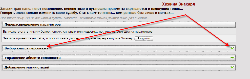 Для этого мы идем в Хижину знахаря и выбираем «Выбор класса персонажа»: