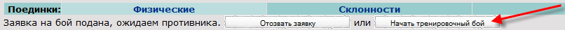 Надеваем Щиток, Рубашку, Меч и в таком обличье идем воевать: переходим в «Поединки» / «Физические» / «Подать заявку на бой» / «Тренировочный бой»