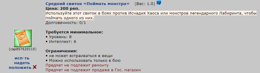 В случае успешной поимки в инвентарь персонажа добавляется свиток «Выпустить монстра», на котором указан ник пойманного монстра.