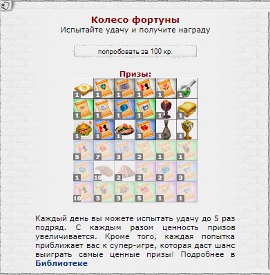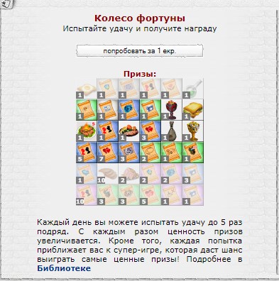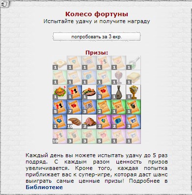 При пятой попытке, вы можете получить призы из 13-30 лотов. Стоимость игры 3 екр.