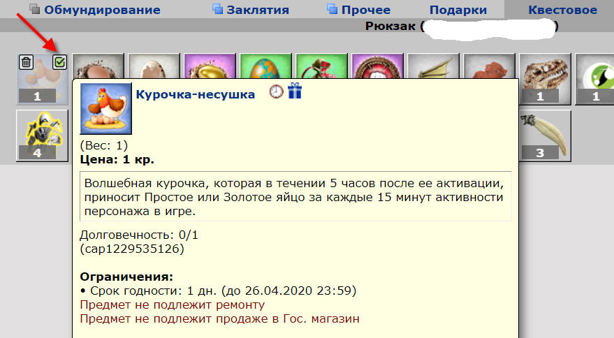 Сама же курица и все яйца будут находится в рюкзаке, в разделе Квестовое. Активность Курицы - 5 часов, после чего нужно будет добыть и активировать другую, если хотим.