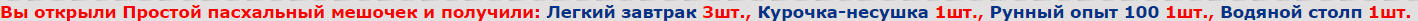 Когда мы накопили более 2 Золотых яйц, мы можем каждые 2 Золотых яйца обменять на Золотой Пасхальный мешочек, который содержит 5 еврокредитов, Курица-насушка(хотя в описании ее нет, но она есть!) и еще пару вещей в нем: