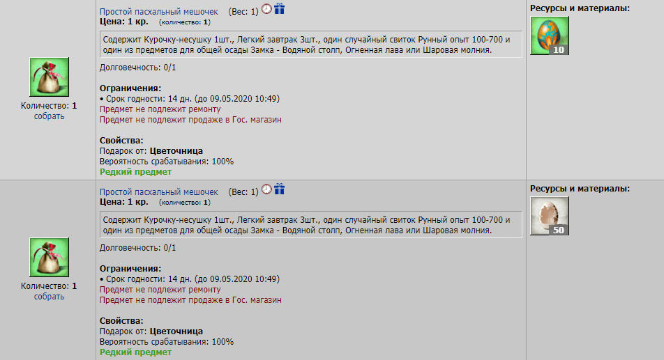 Когда мы поличили 10 Раскрашенных яиц, либо накопили 50 Разбитых, то мы направляемся в Цветочный Магазин, в раздел Пасхальный прилавок, там мы обменяем битые и крашенные яйца на Простой Паскальный мешочек.