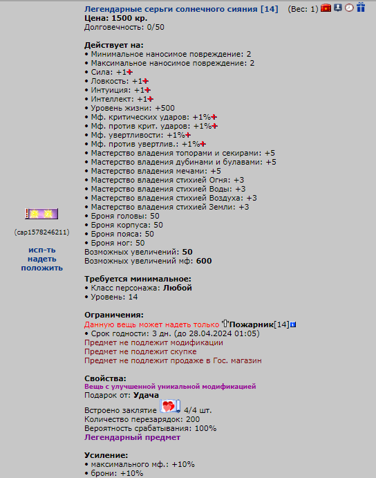 *** артефакт Серьги солнечного сияния можно надевать без учета надетых на персонажа личных и храмовых артефактов;