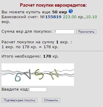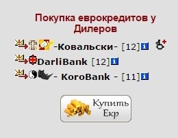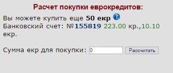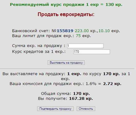 Тут нам рекомендуют курс продажи екр, так же можно увидеть состояние счёта .На продажу екр стоит лимит. Все игроки, которые были зарегистрированы до ввода Биржы имеют лимит в 100 екр.Все остальные игроки имеют лимит 0 екр, но при покупки еврокредитов у Дилера ваш лимит автоматический поднимается на купленную сумму екр.
