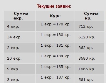 Система рассчитает общую сумму. Если к пример вы захотите купить 6 екров (отталкиваясь от первой колонки) , то система рассчитает нам сумму следующим образом: 4 екр по 178 кр + 2 екр по 180 кр. При покупки система начинает покупать екры по самой минимальной выставленной цене.