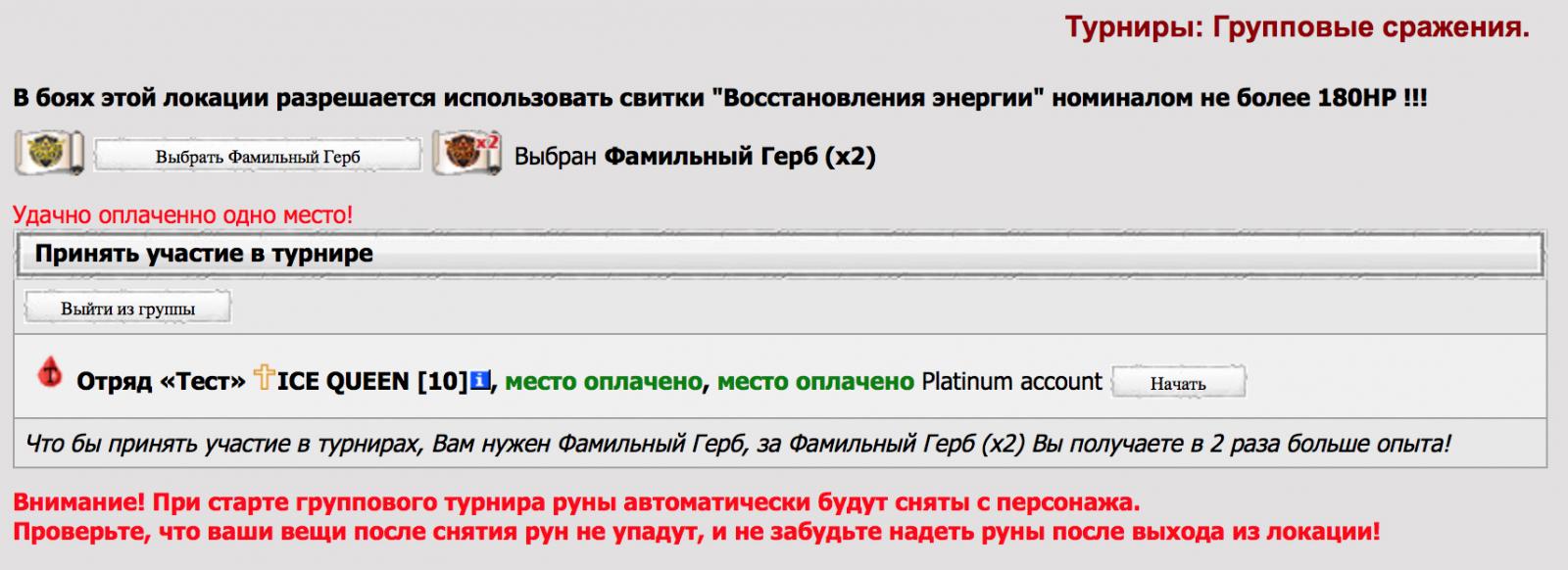 Таким образом, как мы видим, успешный поход в Группы на Ристалище - мероприятие довольно затратное. При этом использованная магия не пойдет на прокачку рун, поскольку руны в бой брать бесполезно, они слетят при начале боя. Можно идти и без особой экипировки, может, вы и не станете победителями, однако некоторое количество опыта за урон вы получите. С другой стороны, вы никогда не знаете, сколько команд и с какой экипировкой будет участвовать в Групповых сражениях в текущие 6 часов. Если вы будете единственной командой, то получите победу.