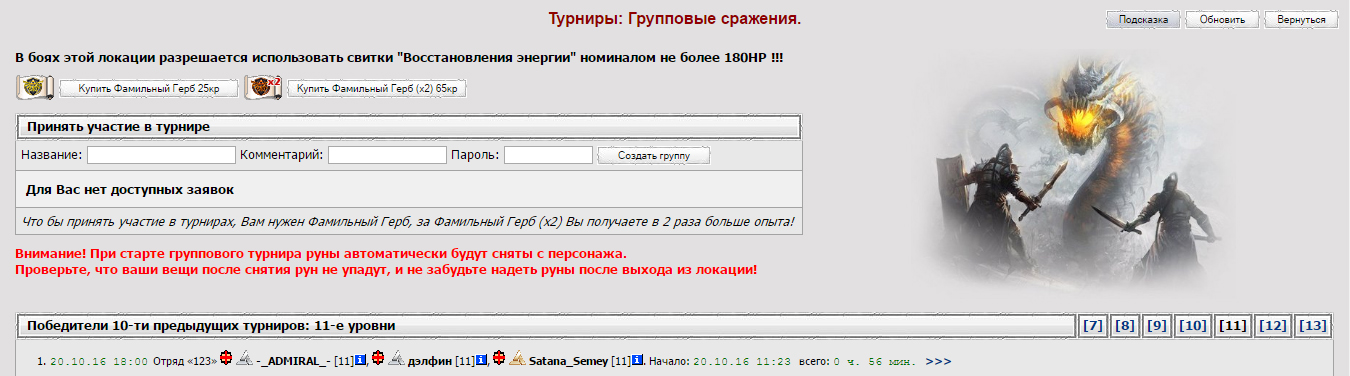 Когда вы готовы, вам осталось позаботиться о пропуске в Групповые сражения - Фамильном гербе. Они бывают двух видов - простой «Фамильный герб» и «Фамильный герб (х2)». Если купить «Фамильный герб (х2)», то по окончании боя игрок получит двойной опыт. В команду можно войти с любым гербом, и каждый член команды получит опыт в соответствии с купленным гербом. Фамильный Герб можно получить в акции Бойцовский дух или купить прямо на входе в Групповые сражения, здесь цены на гербы зависят от уровня участника:
