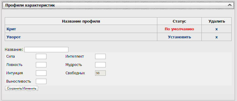 | Если у вас пока нет ни одного профиля, то один надо создать. Для этого нужно дать профилю название, вписать в статы необходимые цифры и нажать кнопку "Сохранить/изменить". |