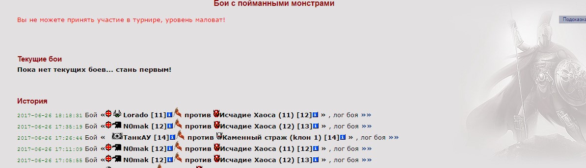 Раньше между посещением Групповых сражений действовал 6-часовой таймаут. Теперь таймаут отменен, и для того, чтобы попасть в Групповые сражения, нужно провести 10 хаотических боев. Поэтому прежде, чем отправляться бить монстров, убедитесь, что с момента последнего посещения Групп вы провели необходимое количество боев, чтобы ваши партнеры вас не ждали напрасно. Узнать, сколько у вас хаотических боев для Ристалища, можно, посмотрев у себя в инфе.