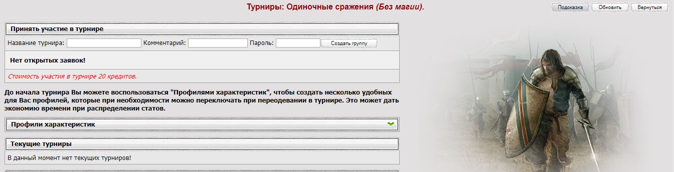| Выйдите из настроек через кнопку "Вернуться". Вы увидите список участников турнира. До начала боя вы не сможете увидеть информацию о персонажах, участвующих в турнире. При попытке открыть инфу вы увидите перед собой невидимку. Вы не можете заранее узнать, у кого какие статы и что на ком надето. |