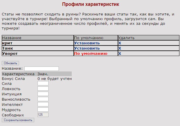 Как вы успели заметить на рисунке в создании профиля нет раскидывания мастерства владения оружием и магией потому что это происходит уже при старте турнира в привычном режиме через инвентарь.