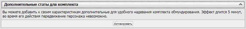 Если Вы не можете одеть комплект, что бы его запомнить (бывают случаи с классом такнов) или с экономить на покупки ужина дракона, Вы можете воспользоваться этой функцией у Знахаря. Вы получите дополнительных характеристик (+75 силы, ловкости и интуиции) для с последующим запоминанием комплекта. Эффект длится 5 минут, во время его действия передвигаться персонажу нельзя.