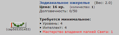 Требования свитка переносятся на встраиваемую вещь, дополняя те требования, которые были на вещи ранее. Как мы видим на картинке ниже, после встраивания магии, у нас добавились требования уровня, интеллекта и мастерство владения магией Света.